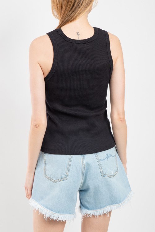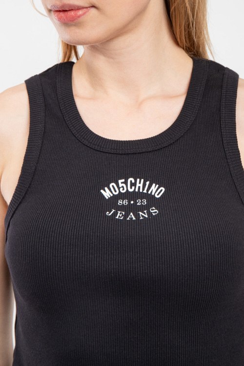 Детали: Женский черный топ из хлопкового микса от Moschino (Москино). Дизайн в рубчик, круглый вырез горловины, без рукавов, облегающий силуэт, брендированный принт на груди