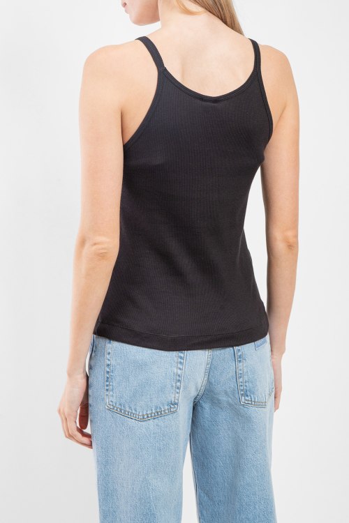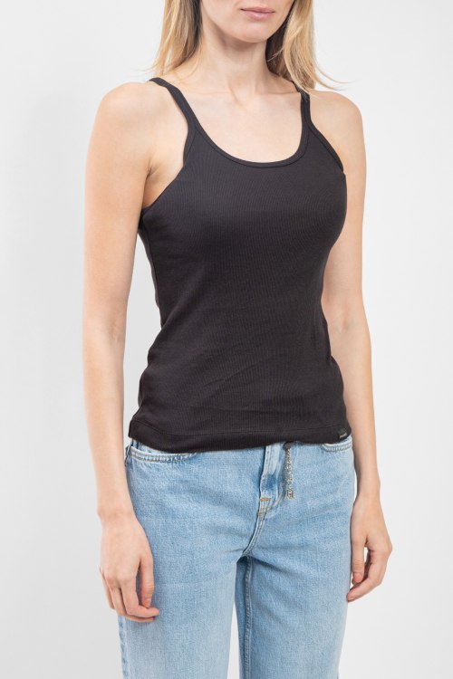 Детали: Женский черный хлопковый топ от Pinko (Пинко). Модель на бретельках, круглый вырез, нашивка с логотипом, классическая длина