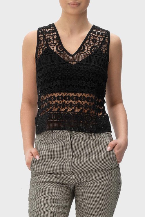 Детали: Женский черный топ из хлопка от TWINSET (Твинсет). Классическая длина, V-образный вырез горловины, комбинированный дизайн, без рукавов