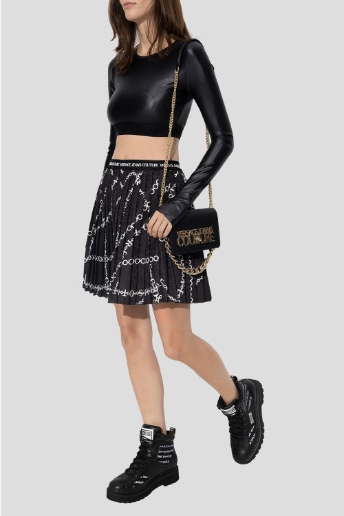 Женский черный топ из полиамида и эластана от Versace (Версаче). Укороченная длина, круглый вырез горловины, длинные рукава, прорези для большого пальца на манжетах, эластичная резинка по низу изделия