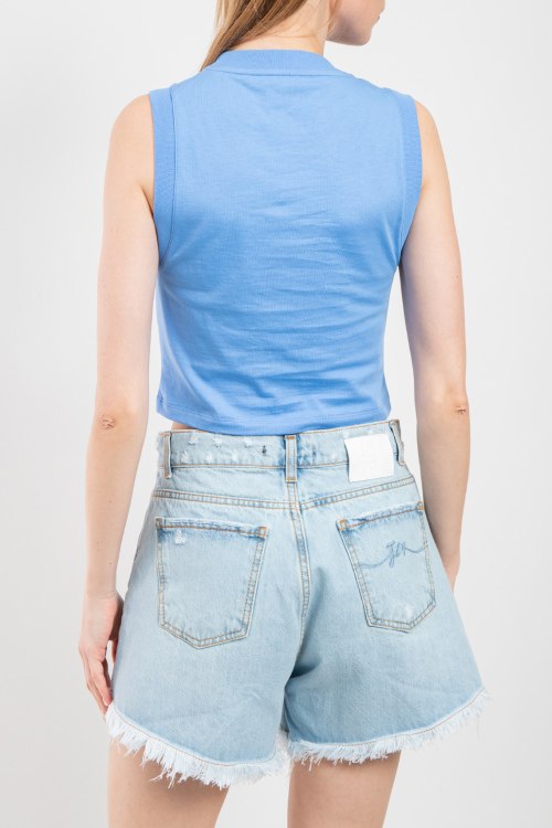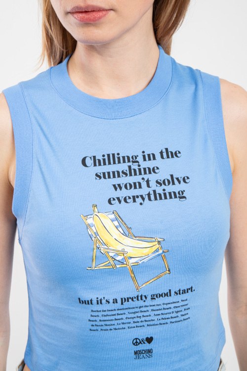 Детали: Женский голубой топ из хлопка от Moschino (Москино). Укороченная длина, круглый вырез горловины, без рукавов, дизайн с принтом спереди