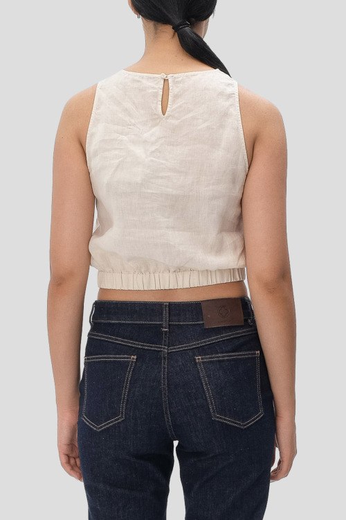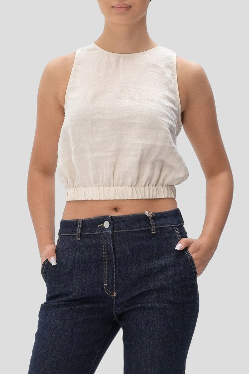 Детали: Женский кремовый льняной топ от Cappellini (Каппеллини). Модель без рукавов, круглый вырез горловины, нижний край на резинке, укороченная длина