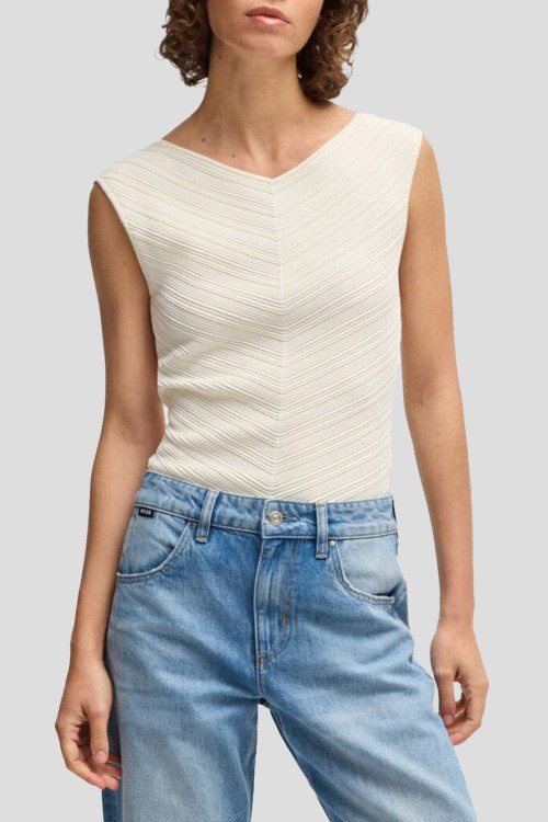 Женский кремовый трикотажный топ Faitini от Hugo Boss (Хуго Босс). Модель без рукавов, V-образный вырез, классическая длина