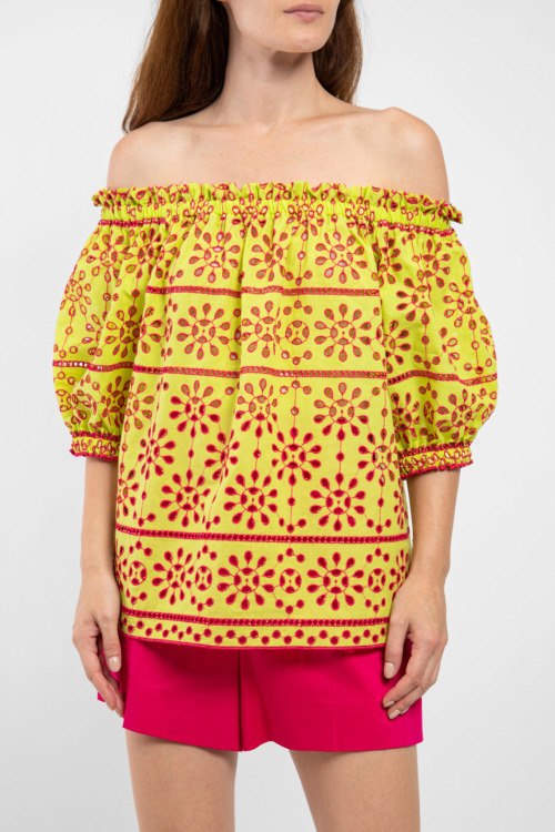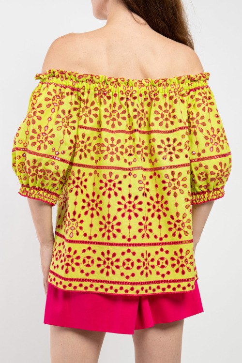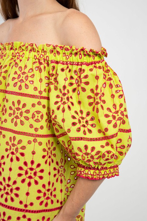 Женский салатовый хлопковый топ от Clips (Клипс). Модель с открытыми плечами, верх на резинке, малиновый перфорированный узор по всей поверхности, укороченный рукав-фонарик с манжетом на резинке, свободный фасон, удлиненная длина.