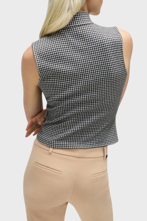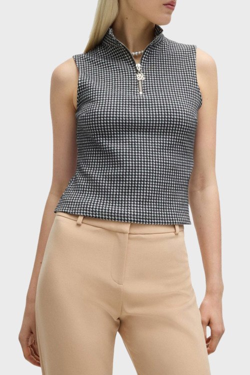 Детали: Женский серый топ из хлопкового микса от Hugo by Hugo Boss (Хуго бай Хуго Босс). Воротник-стойка, горловина на молнии, без рукавов, дизайн с узором "гусиная лапка", укороченная длина