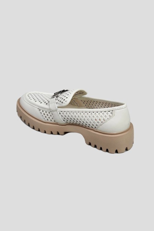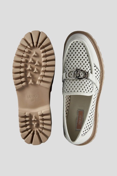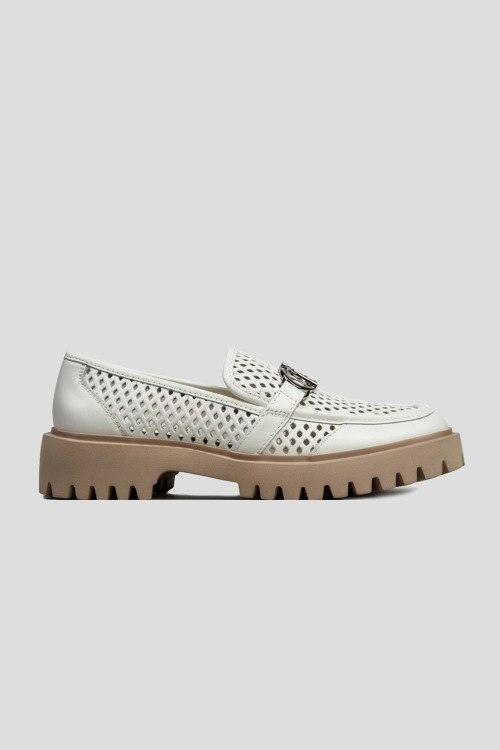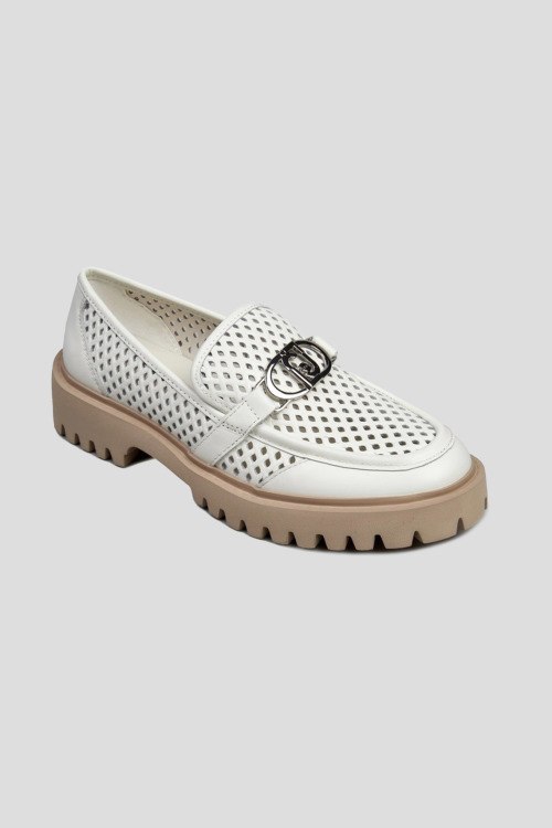 Детали: Женские белые лоферы из натуральной кожи от Liu Jo (Лиу Джо). Закругленный носок, бежевая тракторная подошва, перфорация, ремешок с серебристым металлическим логотипом спереди. Высота каблука: 4 см, платформа: 2 см