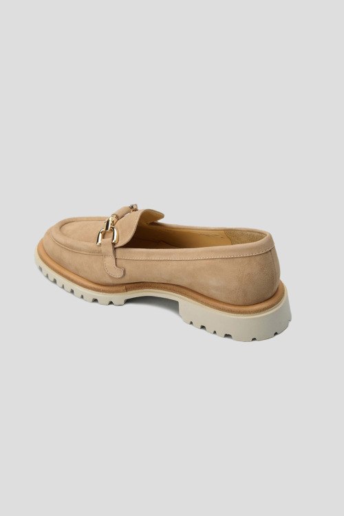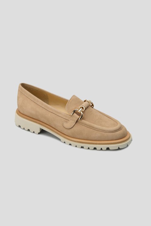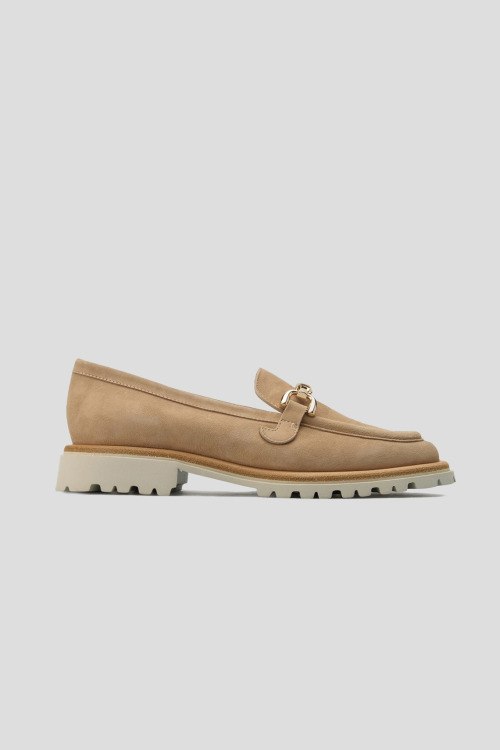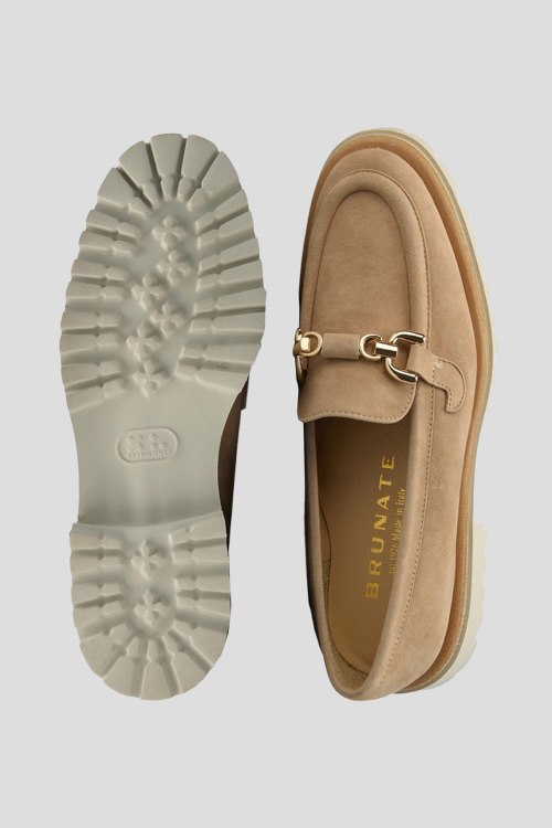 Детали: Женские бежевые замшевые лоферы от Brunate (Брунате). Золотистая фурнитура, закругленный носок, кожаная стелька, широкий каблук