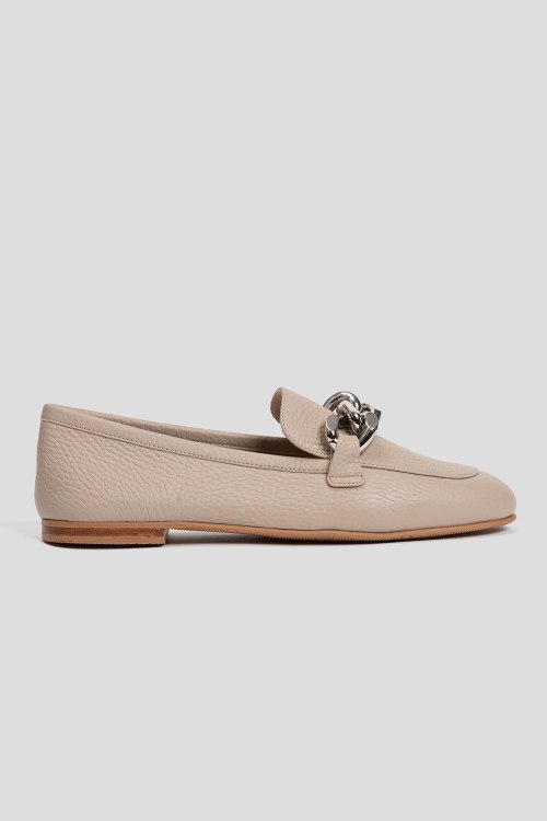 Детали: Женские бежевые лоферы из натуральной кожи от Casadei (Касадей). Миндалевидный носок, кожаная стелька с логотипом бренда, металлическая фурнитура серебристого цвета