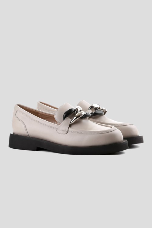 Детали: Женские бежевые лоферы из натуральной кожи от Le Berdes (Ле Бердес). Миндалевидный носок, кожаная стелька с логотипом, спереди металлический декор в виде цепочки