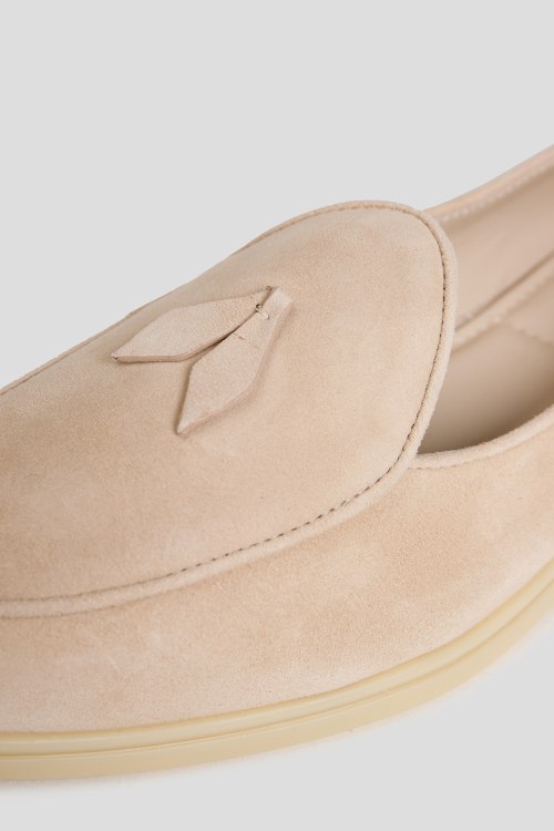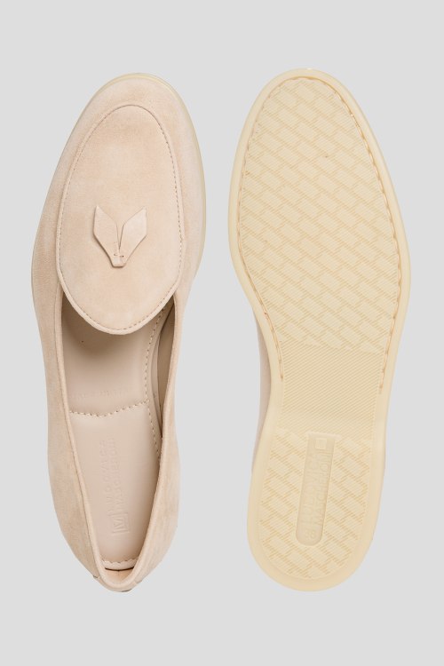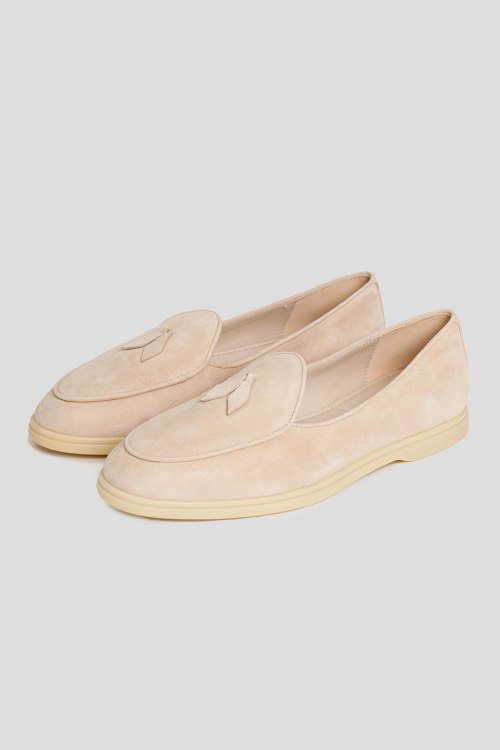 Женские бежевые замшевые лоферы от Ludovica Mascheroni (Лудовика Мачерони). Миндалевидный носок, кожаная стелька с логотипом, бежевая резиновая подошва