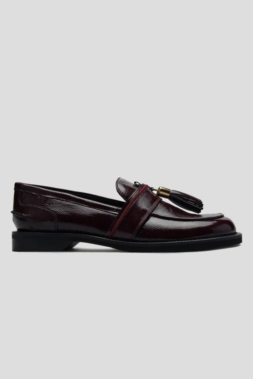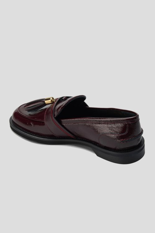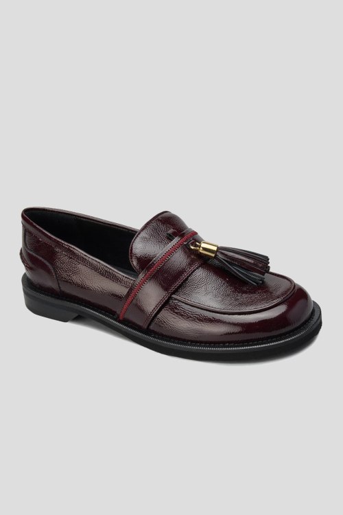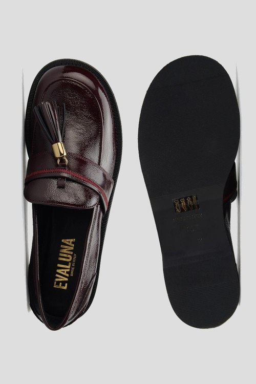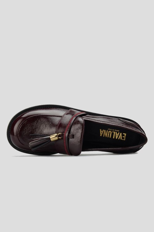 Детали: Женские бордовые лаковые лоферы от Evaluna (Эвалуна). Глянцевая кожа, декор кисточкой, закругленный носок, кожаная стелька