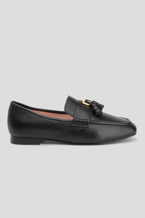Детали: Женские черные лоферы из натуральной кожи от Coccinelle (Кочинелле). Миндалевидный носок, кожаная стелька с логотипом, спереди металлическая вставка с кисточкой, блочный каблук