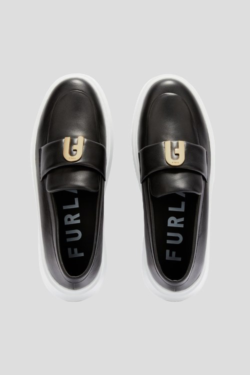 Женские черные кожаные лоферы Furla Sport от Furla (Фурла). Модель из гладкой кожи, значок логотипа спереди, закругленный носок, белая подошва.