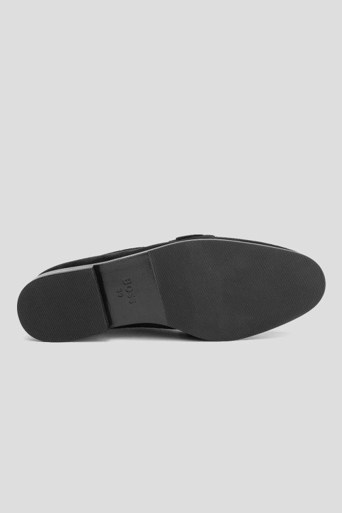 Детали: Женские черные лоферы из натуральной замши от Hugo Boss (Хуго Босс). Миндалевидный носок, металлическая фурнитура золотистого цвета, блочный каблук