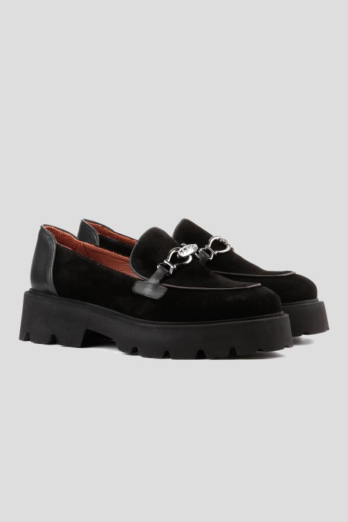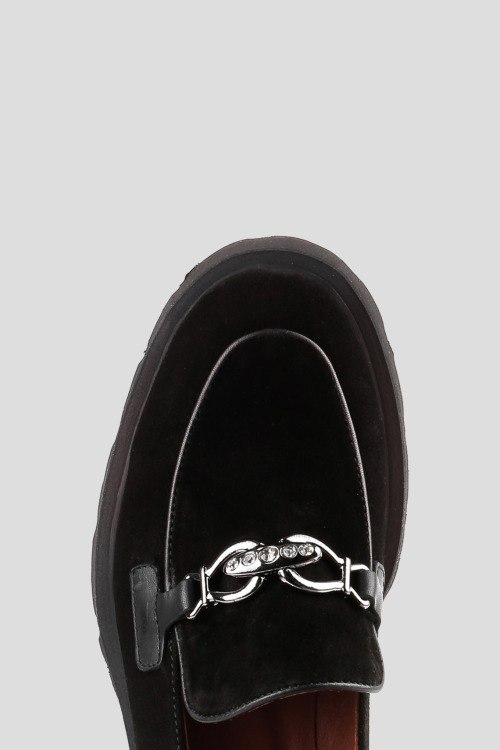 Детали: Женские черные лоферы из натуральной замши от Le Berdes (Ле Бердес). Миндалевидный носок, комбинированный дизайн, тракторная подошва, металлическая фурнитура