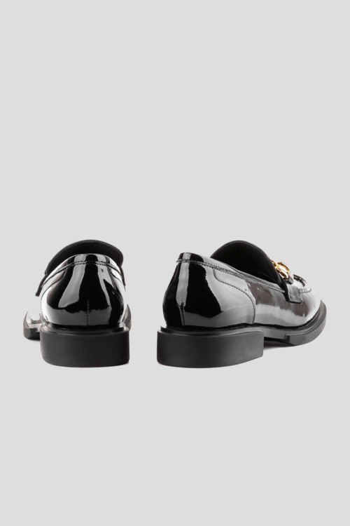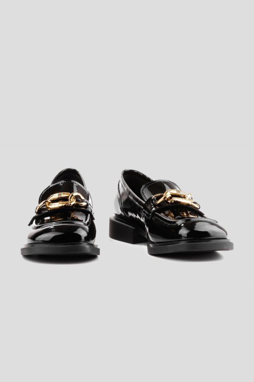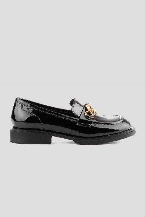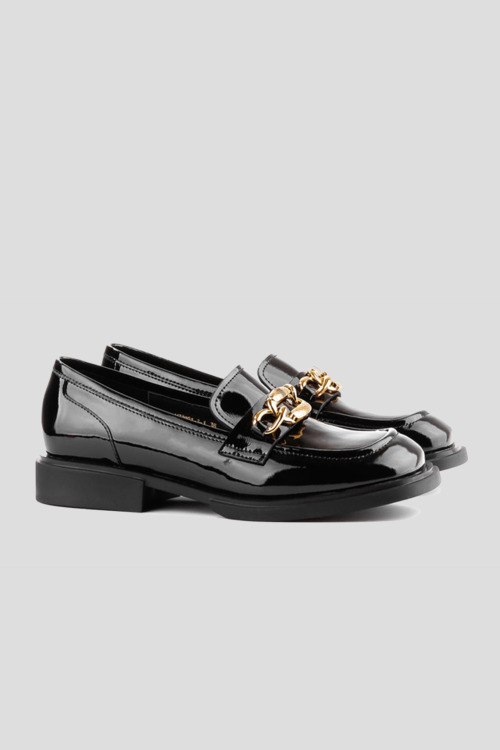 Детали: Женские черные лоферы из лакированной кожи от Le Berdes (Ле Бердес). Закругленный носок, спереди ремешок в тон изделия с золотистой цепью, массивная подошва с блочным каблуком, стелька из натуральной кожи