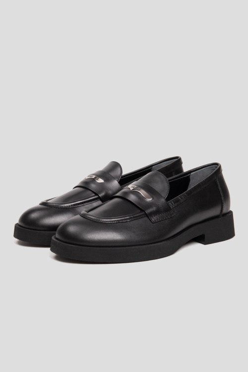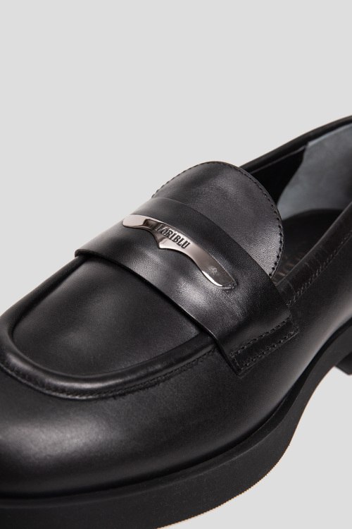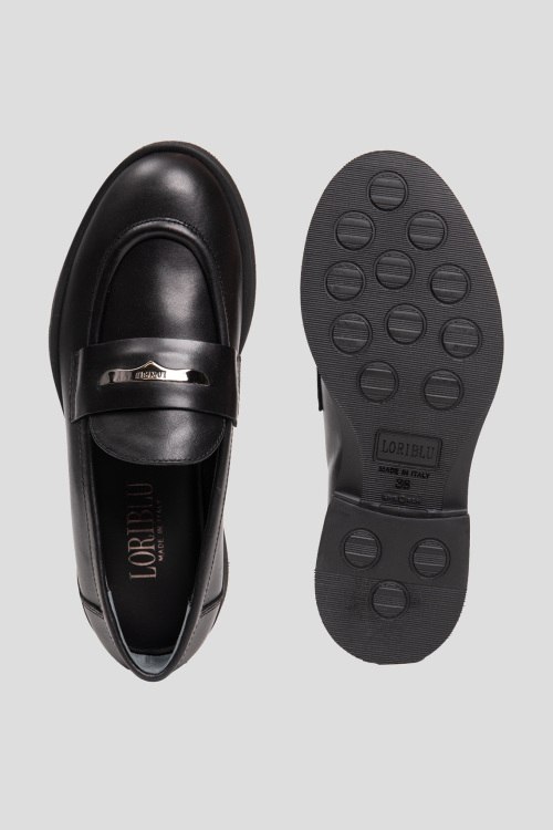 Детали: Женские черные кожаные лоферы от Loriblu (Лориблу). Модель из гладкой кожи, металлическая нашивка с логотипом, закругленный носок, кожаная стелька. Высота каблука: 3 см, подошва: 2 см