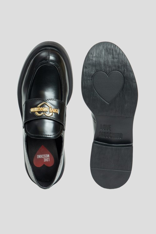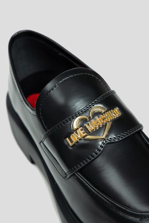 Детали: Женские черные кожаные лоферы от Love Moschino (Лав Москино). Модель из гладкой кожи, золотистый логотип, закругленный носок. Высота платформы: 3,5 см. Длина стельки составляет: 24 см. Параметры указаны для размера: 38