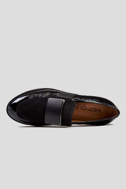 Детали: Женские черные лаковые лоферы от Mot-Cle (Мот-Кле). Глянцевый эффект, текстильный язычок с металлической фурнитурой, миндалевидный носок, кожаная стелька. Высота каблука: 3 см, высота подошвы: 1.5 см
