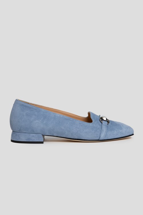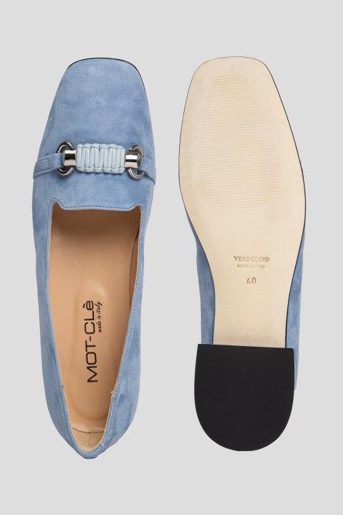 Детали: Женские голубые лоферы из натуральной замши от Mot-Cle (Мот-Кле). Квадратный носок, спереди декорированы металлической фурнитурой, кожаная стелька с логотипом бренда, блочный низкий каблук