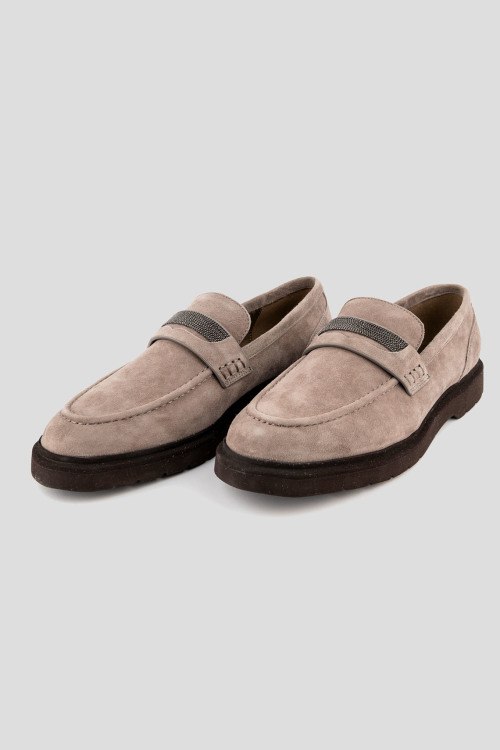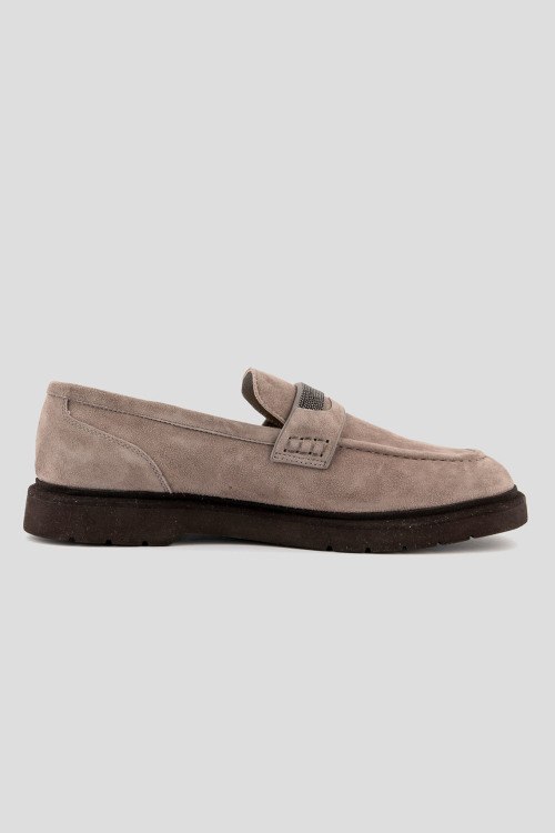 Детали: Женские замшевые лоферы цвета мокко от Brunello Cucinelli (Брунелло Кучинелли). Декор серебристыми бусинами, закругленный носок, кожаная стелька, темно-коричневая подошва
