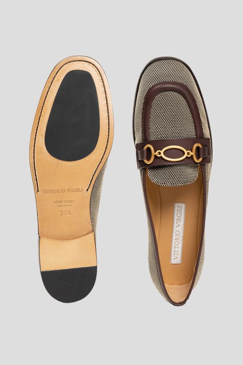 Детали: Женские коричневые лоферы из рафии и натуральной кожи от Vittorio Virgili (Витторио Вирджили). Миндалевидный носок, кожаная стелька с лого, металлическая фурнитура, комбинация цветов и материалов, блочный каблук