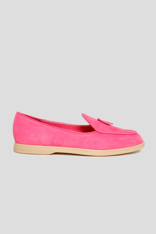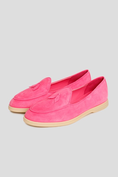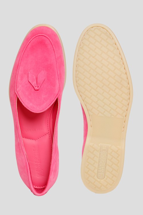 Детали: Женские розовые замшевые лоферы от Ludovica Mascheroni (Лудовика Мачерони). Миндалевидный носок, кожаная стелька с логотипом, бежевая резиновая подошва
