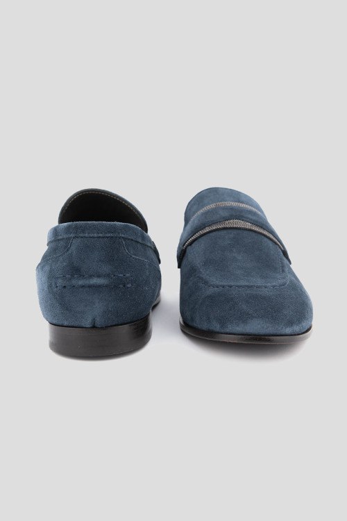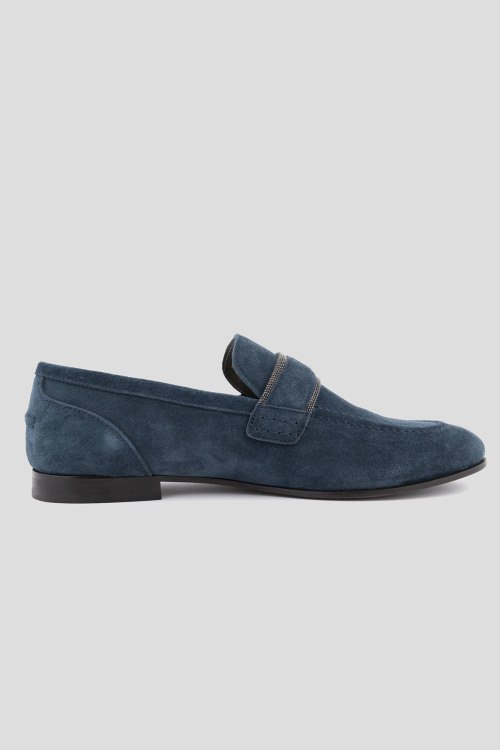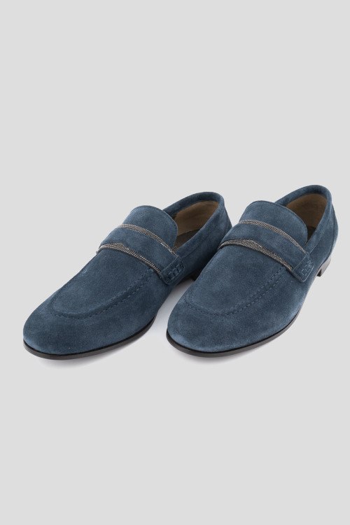 Детали: Женские синие замшевые лоферы от Brunello Cucinelli (Брунелло Кучинелли). Декор бусинами, миндалевидный носок, кожаная стелька