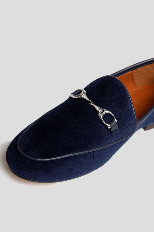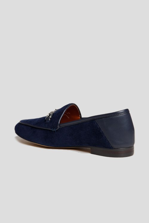 Женские темно-синие лоферы из текстиля (микровельвет) и натуральной кожи (отделка) от Coach (Коуч). Миндалевидный носок, металлическая фурнитура серебристого цвета спереди, кожаная стелька с логотипом бренда (не вытаскивается), прочная подошва из кожи распределяет ударную нагрузку на стопы, чтобы каждый шаг был уверенным.