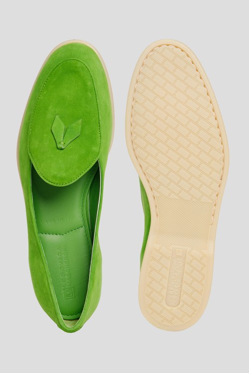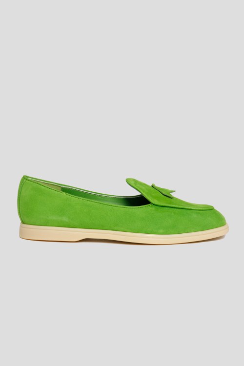 Детали: Женские зеленые замшевые лоферы от Ludovica Mascheroni (Лудовика Мачерони). Миндалевидный носок, кожаная стелька с логотипом, бежевая резиновая подошва