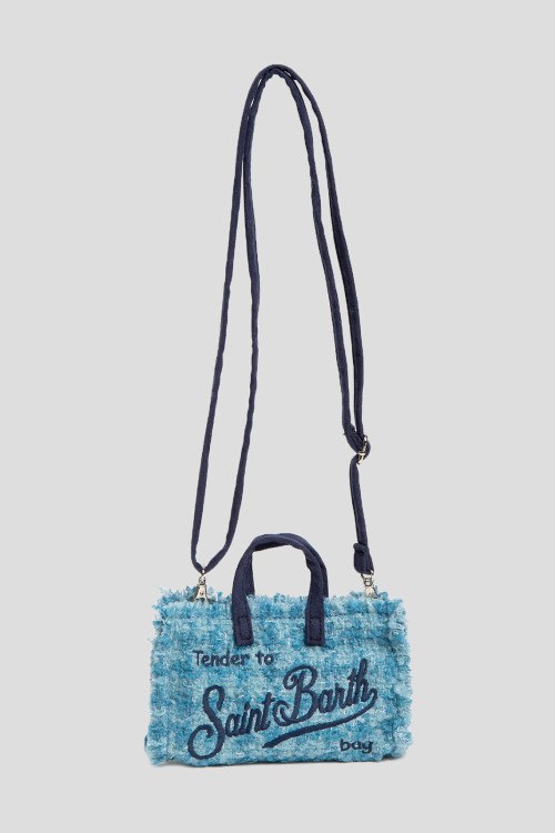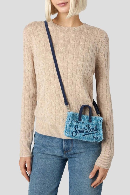 Детали: Женская голубая текстильная мини-сумка от Mc2 Saint Barth (Mc2 Сент Барт). Вышитый логотип, две круглые ручки, съемный плечевой ремень, золотистая фурнитура, одно отделение. Размеры: 15 x 10 x 4 см