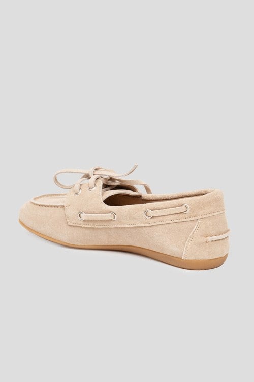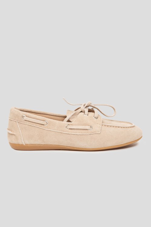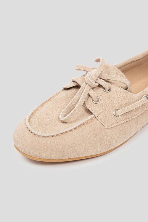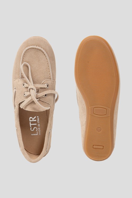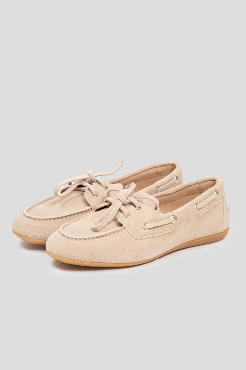 Детали: Женские бежевые замшевые мокасины от L'Estrosa (Лестроса). Модель из мягкой замши, тональная строчка, шнуровка, закругленный носок, стелька с логотипом