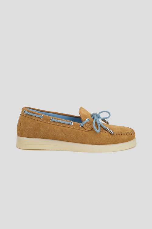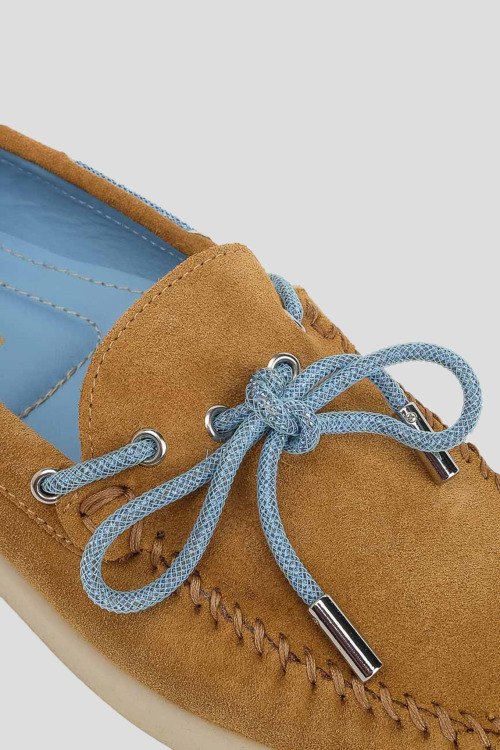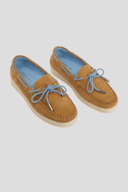 Детали: Женские коричневые замшевые мокасины от Stokton (Стоктон). Тональная строчка, голубые завязки, закругленный носок