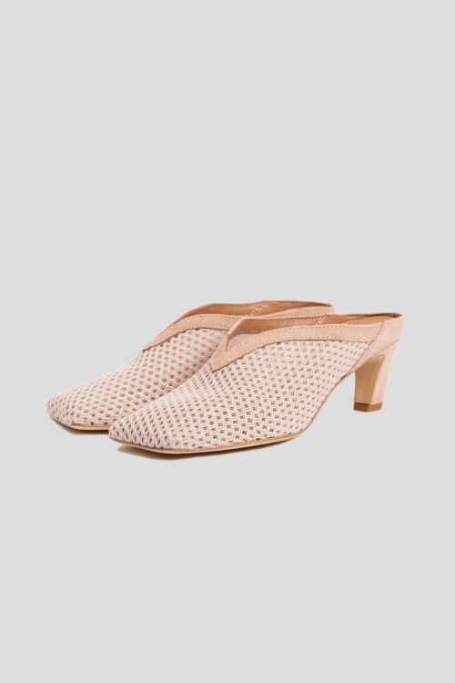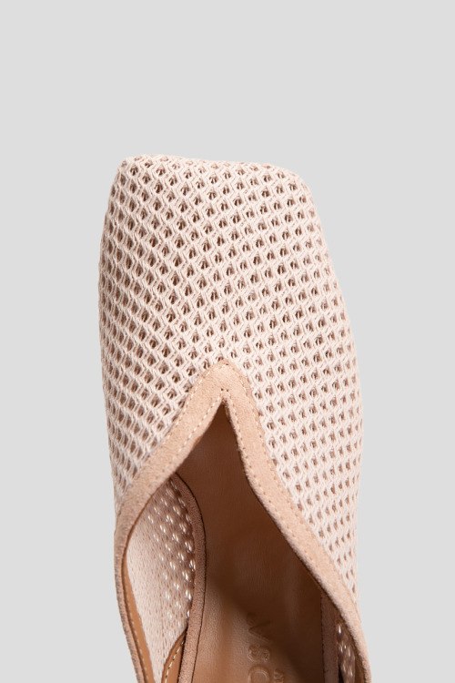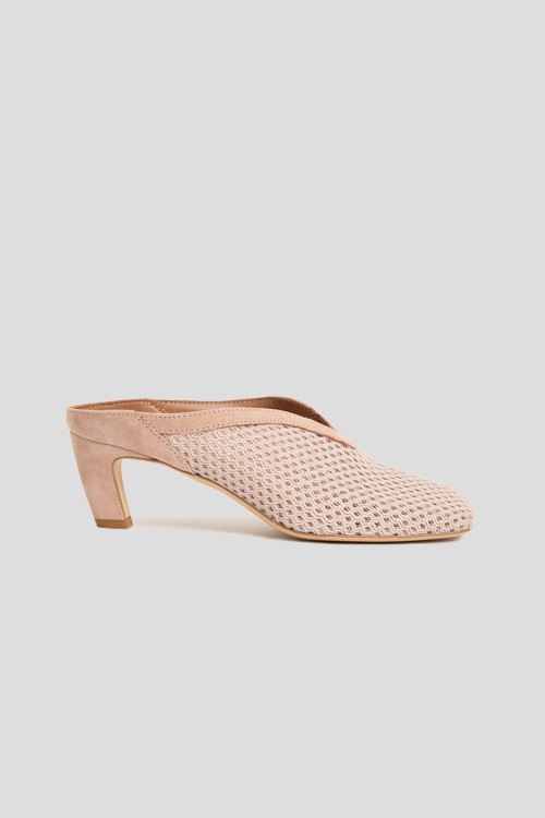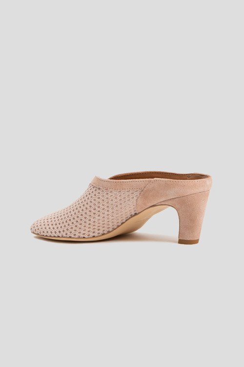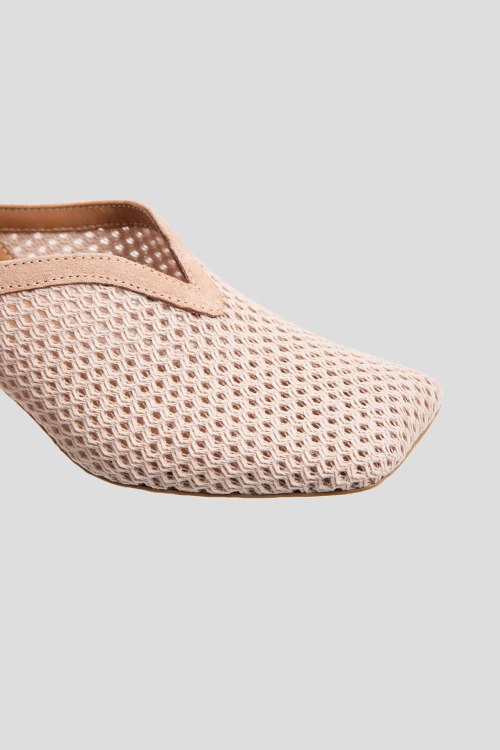 Женские пудровые мюли из текстиля от L'Estrosa (Лестроса).от Loriblu (Лориблу). Квадратный носок, перфорированный дизайн, открытая пятка, кожаная стелька с логотипом бренда, каблук высотой: 6.5 см