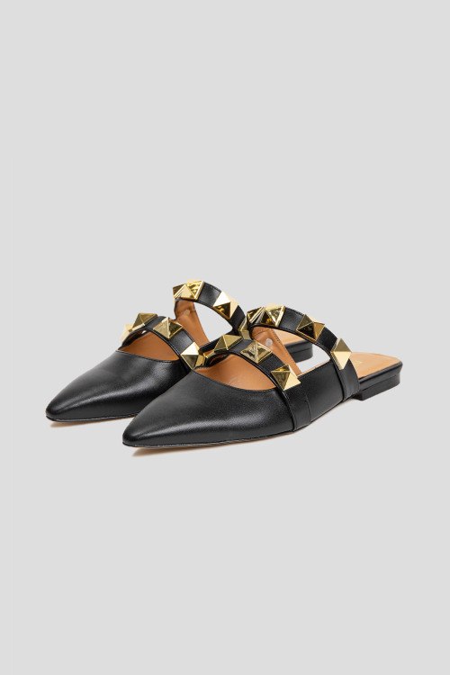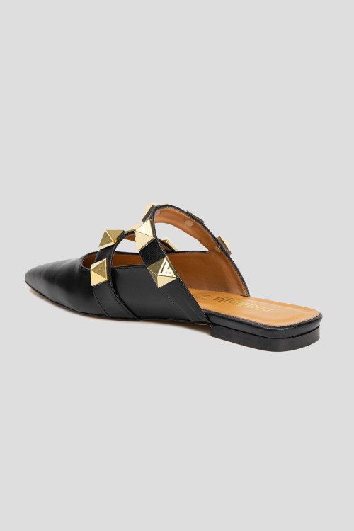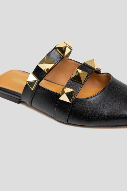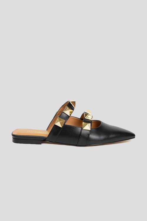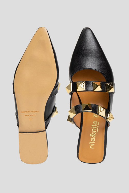 Детали: Женские черные мюли из натуральной кожи от Nila&Nila (Нила Нила). Острый носок, кожаная стелька с логотипом бренда, декорированы металлической фурнитурой