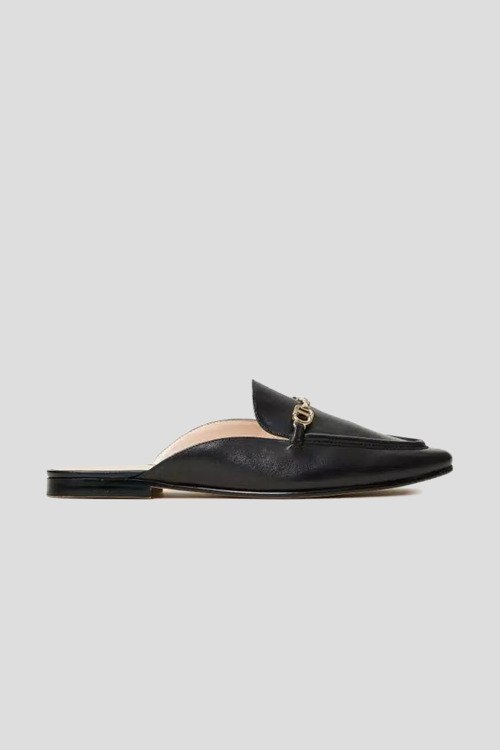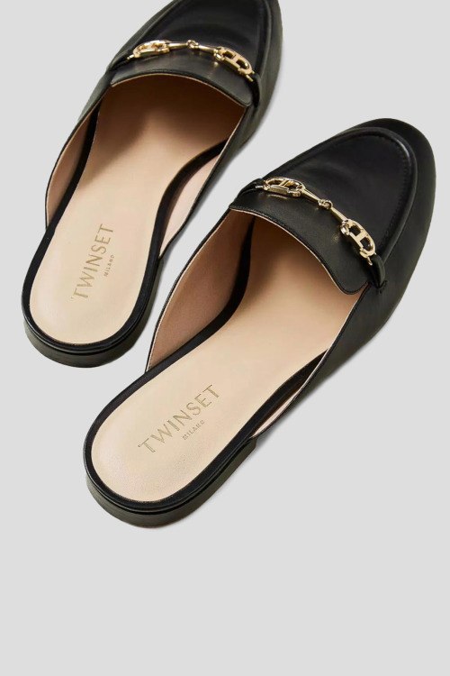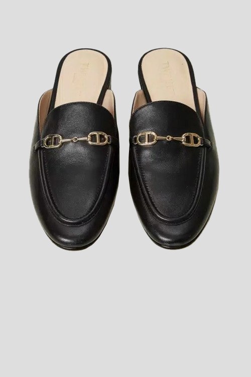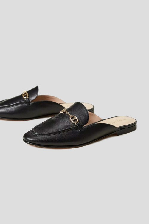 Детали: Женские черные кожаные мюли от TWINSET (Твинсет). Модель из гладкой кожи, логотип Oval T, миндалевидный носок, плоская подошва