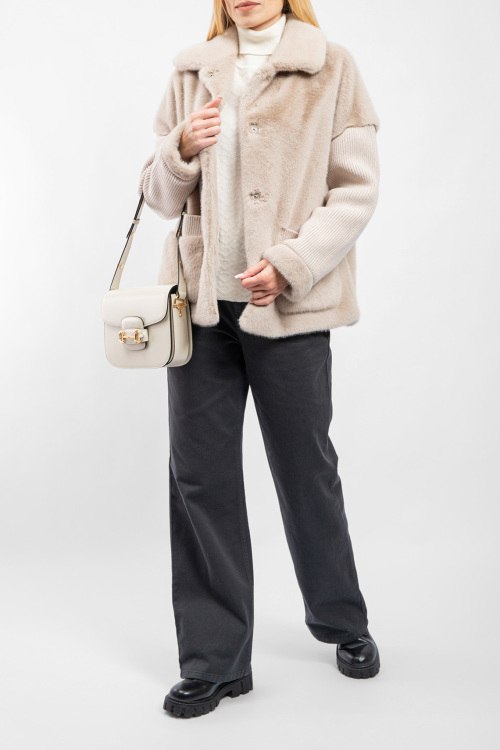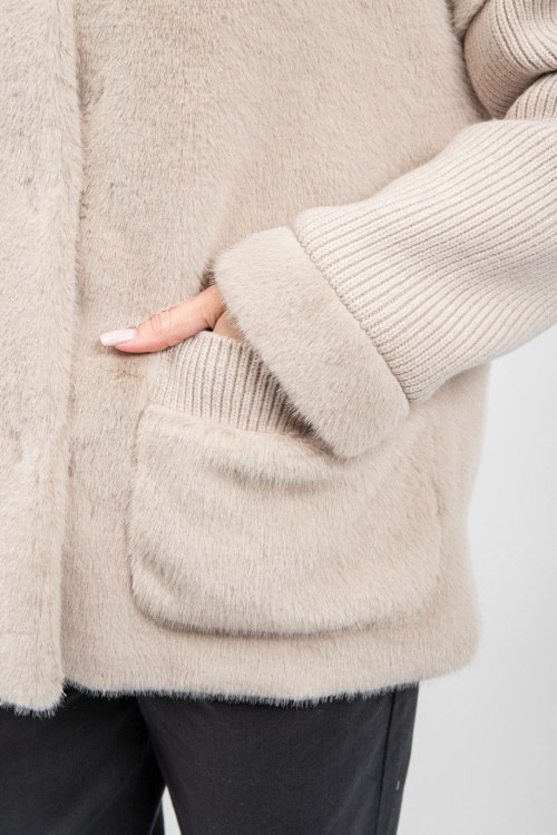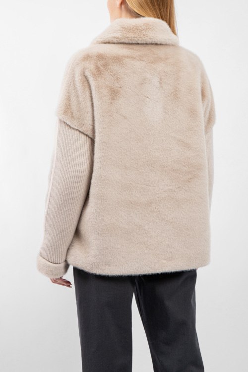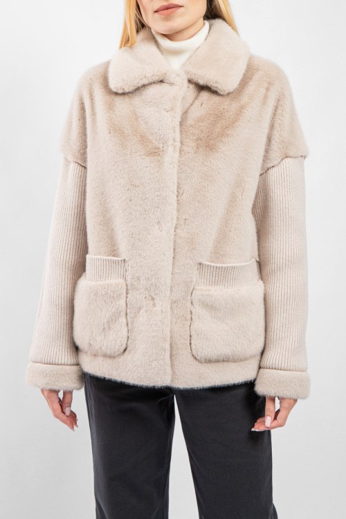 Женская светло-бежевая куртка из искусственного меха от Diego M (Диего М). Отложной воротник, вязаные рукава, два накладных кармана, скрытая застежка на кнопки, классическая длина. Замеры для размера 42: длина: 66 см, ширина груди 58 см, ширина по талии 58 см, длина по внутреннему шву рукава 41 см, ширина рукава 20 см.