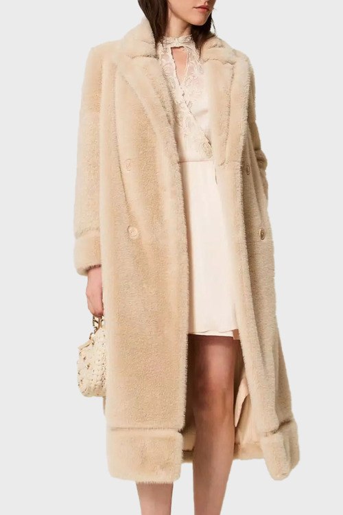 Детали: Женская светло-бежевая шуба из экомеха от TWINSET (Твинсет). Отложной воротник, боковые карманы, застежка на пуговицы, длина-миди