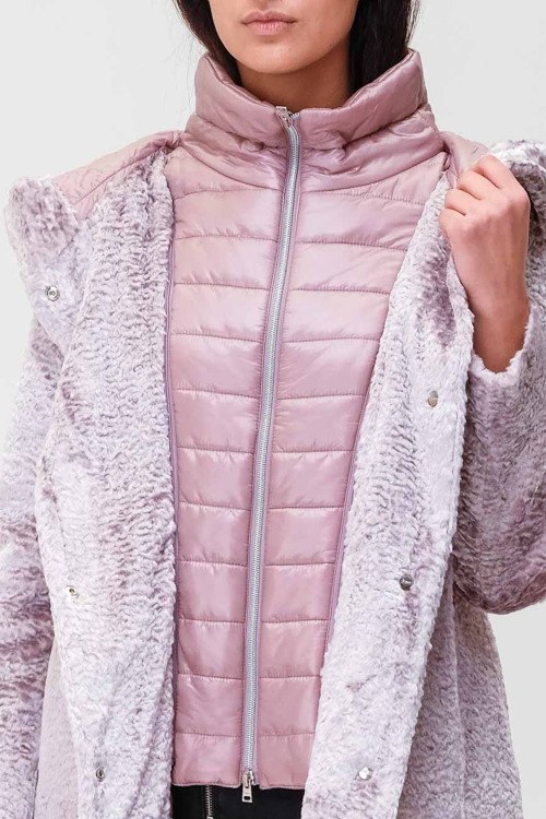Женская куртка с капюшоном лилового оттенка от Herno (Эрно). Застегивается на кнопки, боковые карманы. Отстегивающийся пуховый жилет светло-розового цвета с высоким воротником и застежкой на молнию