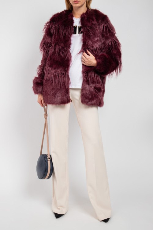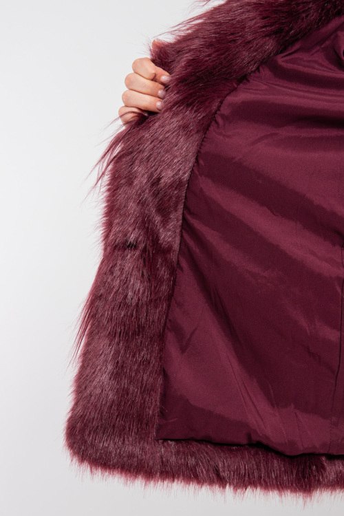 Женская фиолетовая куртка из искусственного меха от Michael Kors (Майкл Корс). Круглый вырез горловины, без воротник, боковые карманы, застежка на крючки, удлиненная длина