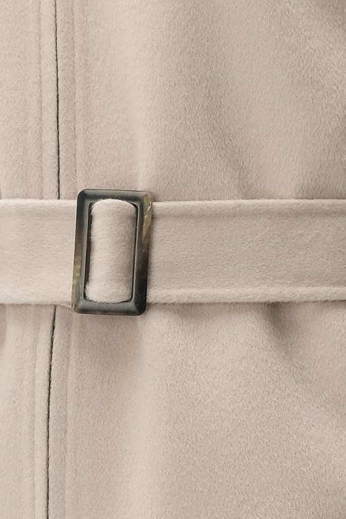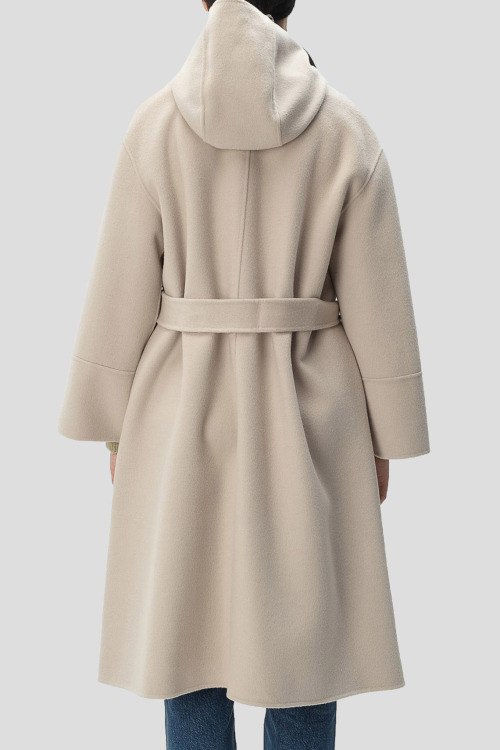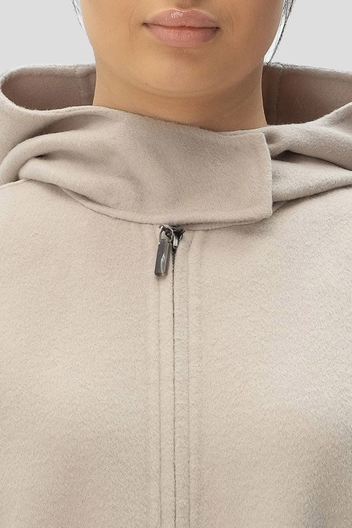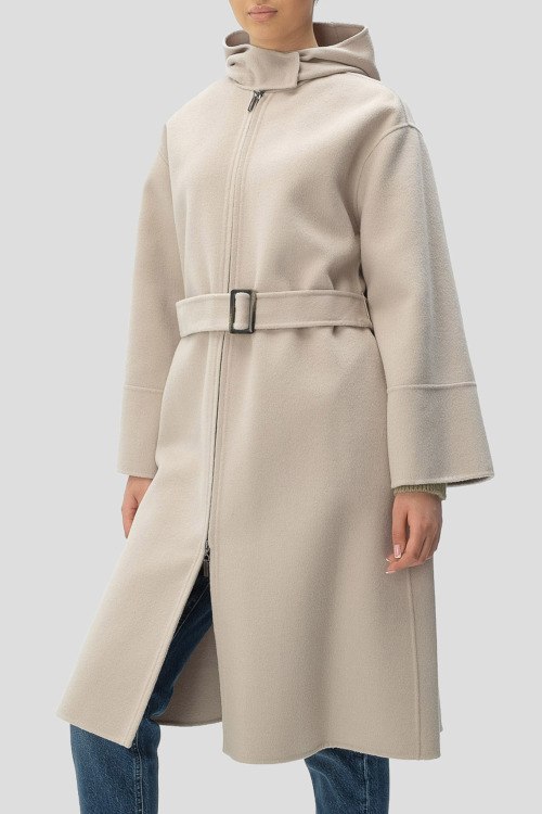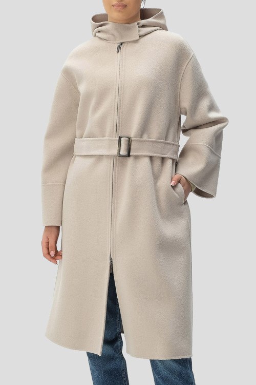 Женское бежевое пальто из шерстяного микса от Emporio Armani (Эмпорио Армани). Длина до колена, застежка на молнию, вшитый капюшон, длинные рукава, пояс в тон изделия, прорезные карманы