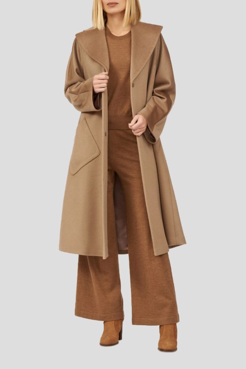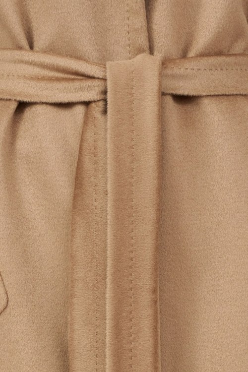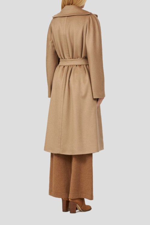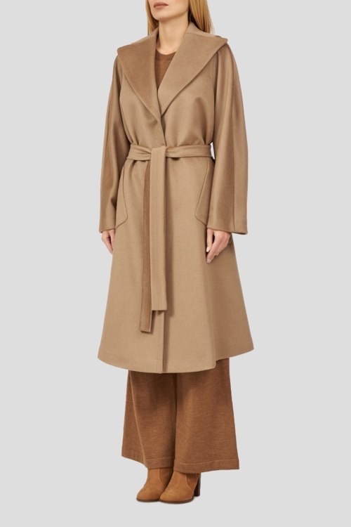 Женское бежевое пальто из шерсти от Marina Rinaldi (Марина Ринальди). Длина миди, отложной воротник, застежка на кнопки, пояс в тон изделия, накладные карманы