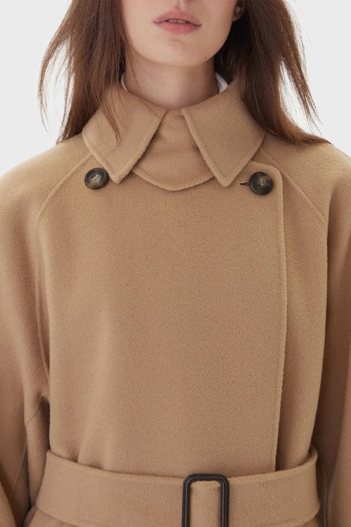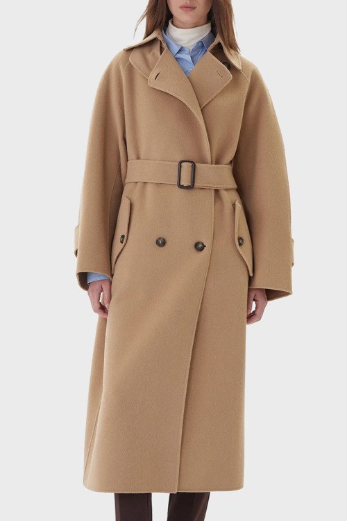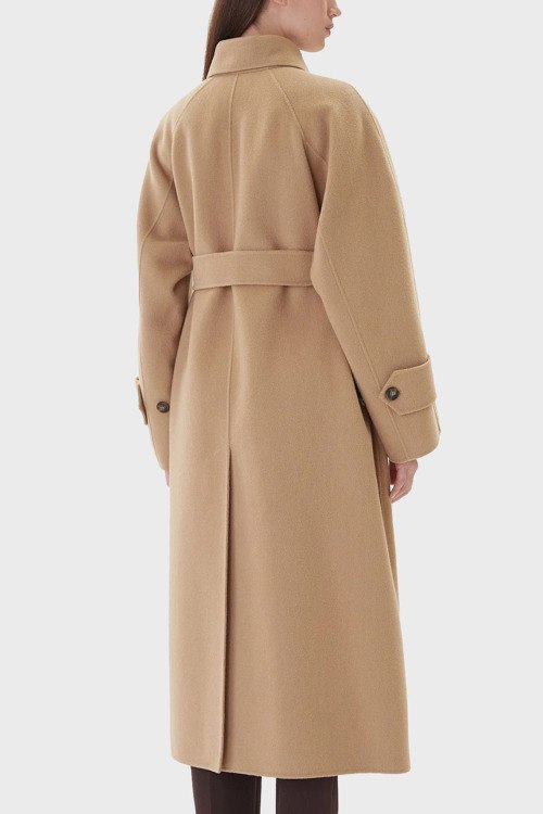 Детали: Женское бежевое шерстяное пальто Cadine от Max Mara Weekend (Макс Мара Викенд). Двубортный фасон, отложной воротник, боковые карманы с клапаном, застежка на пуговицы, в талии с поясом, широкий рукав, длина-миди