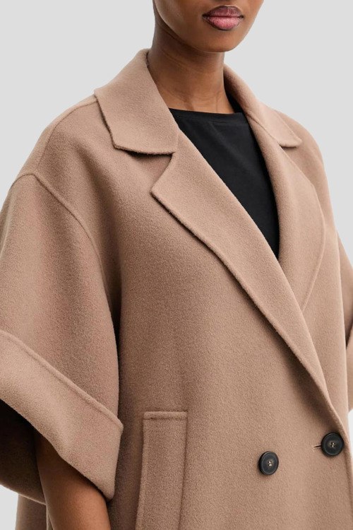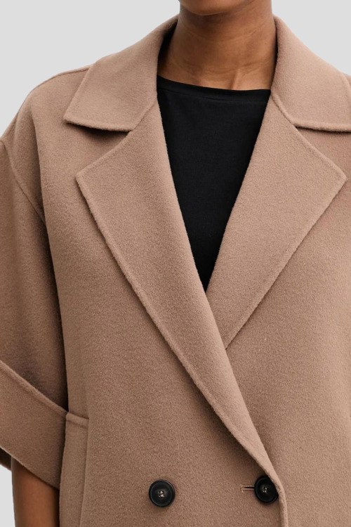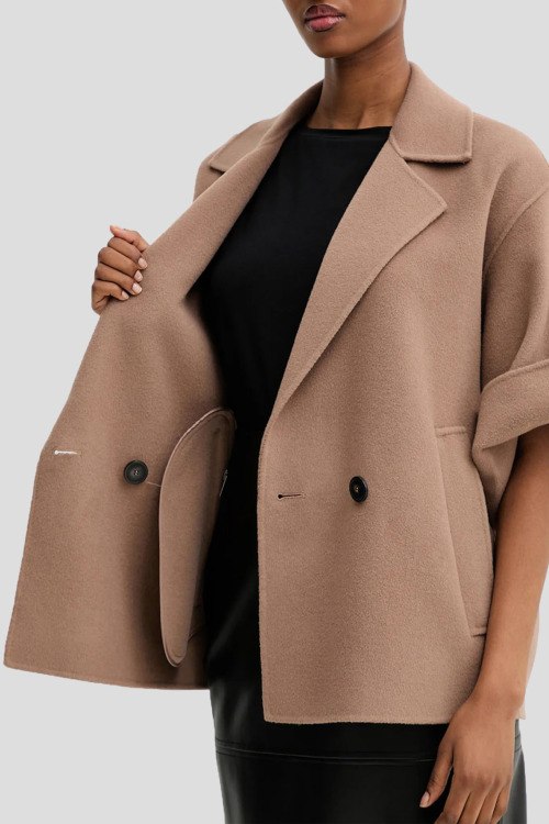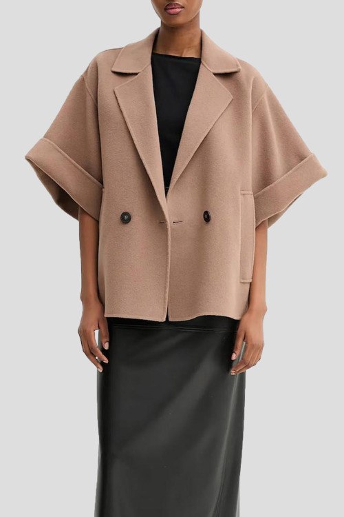 Детали: Женское бежевое шерстяное пальто Pera от Max Mara Weekend (Макс Мара Викенд). Отложной воротник с заостренными лацканами, короткий широкий рукав, боковые карманы, застежка на пуговицу, короткая длина