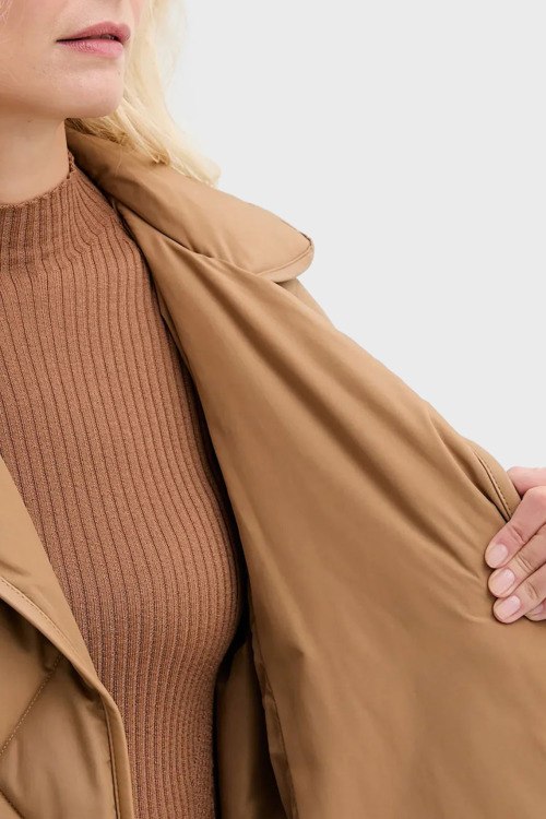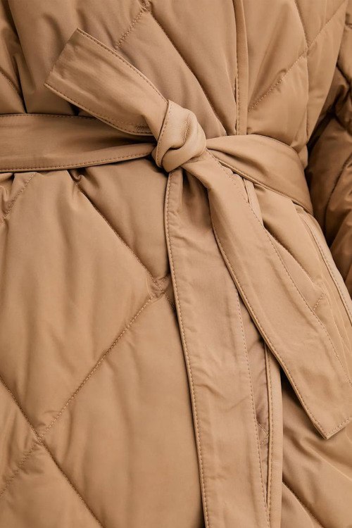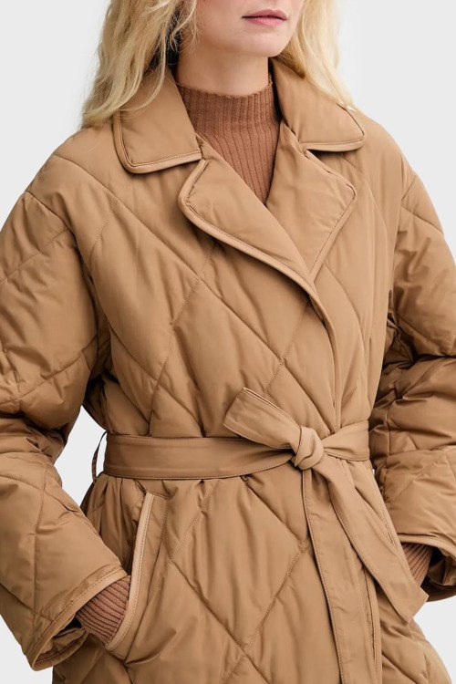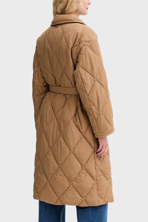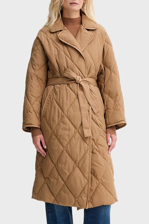 Детали: Женское пальто цвета кэмел от TWINSET (Твинсет). Стеганый дизайн, отложной воротник, боковые карманы, застежка на кнопки, в талии с поясом, длина-миди