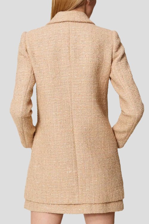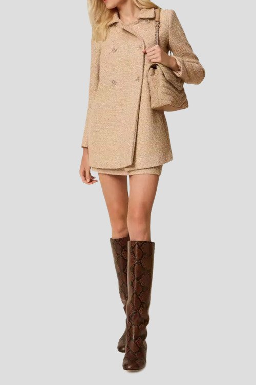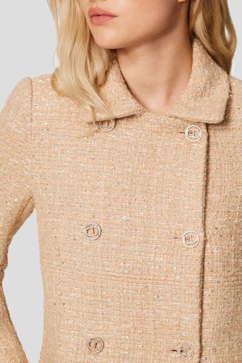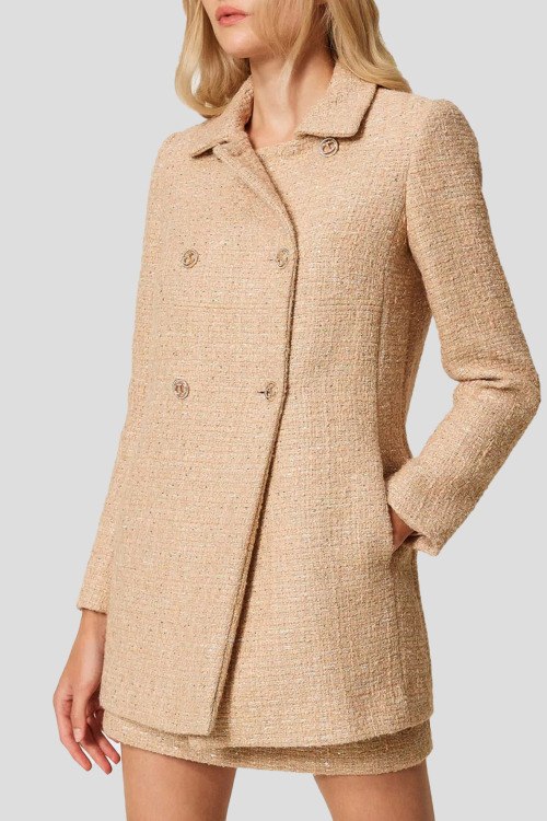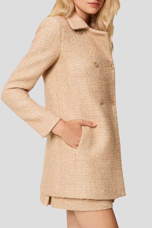 Детали: Женское бежевое пальто из ткани букле от TWINSET (Твинсет). Модель с люрексовой нитью и пайетками, двубортный фасон, отложной воротник, застежка на три пуговицы, боковые карманы, короткая длина