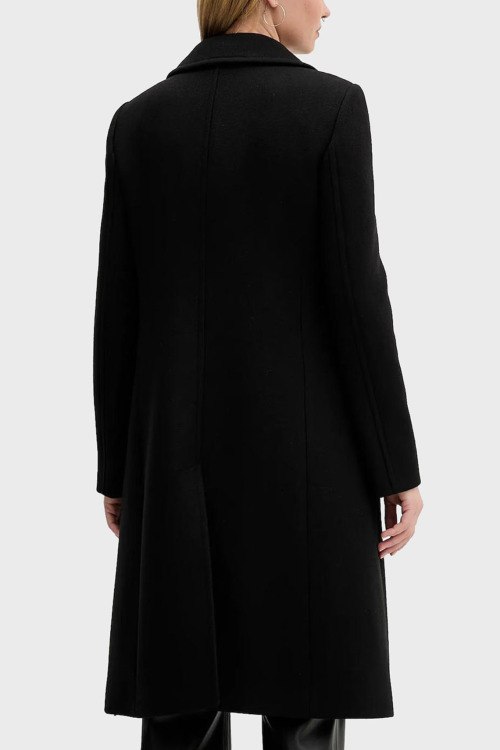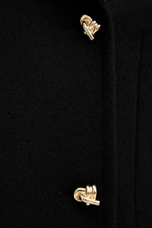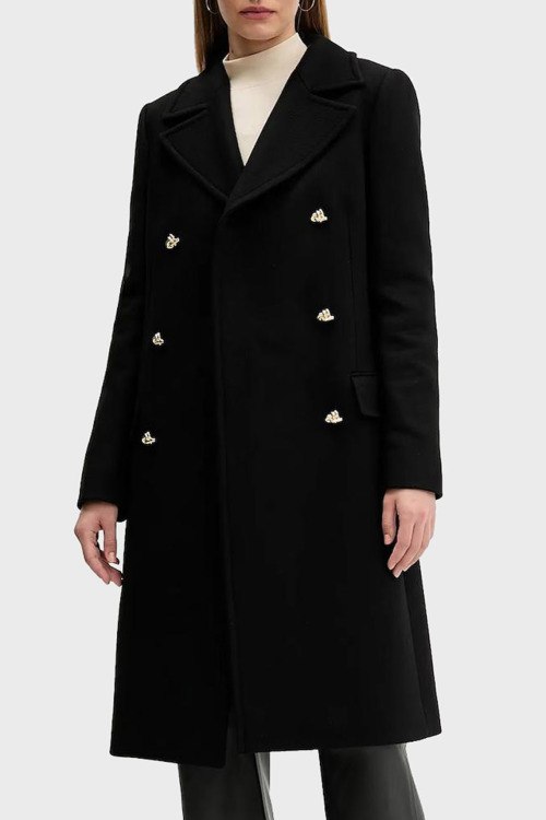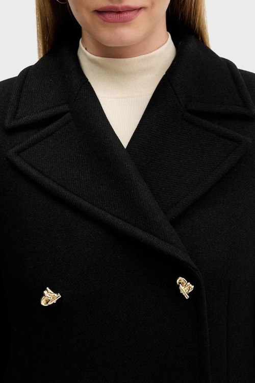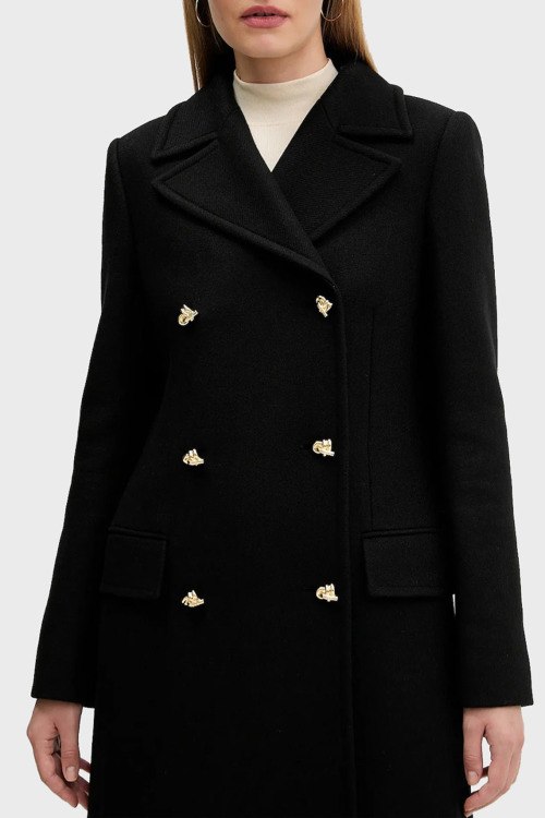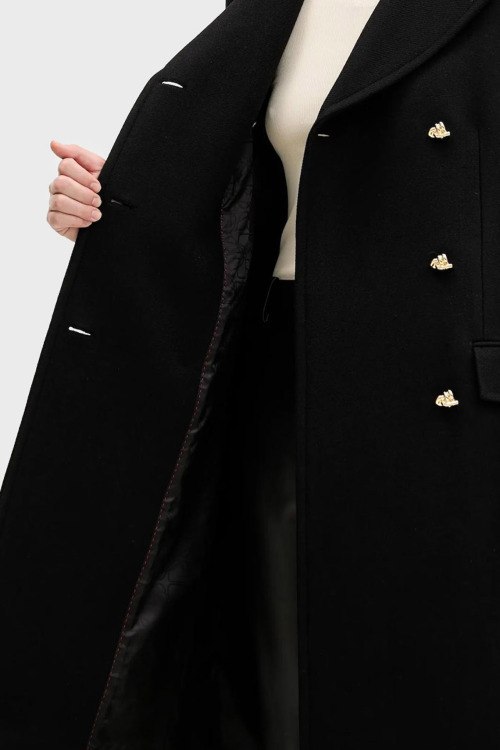 Детали: Женское черное шерстяное пальто Marmina от Hugo by Hugo Boss (Хуго бай Хуго Босс). Двубортный фасон, отложной воротник, передние карманы с клапанами, застежка на золотистые пуговицы, длина-миди
