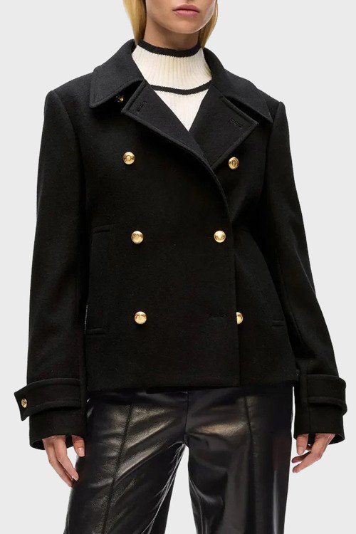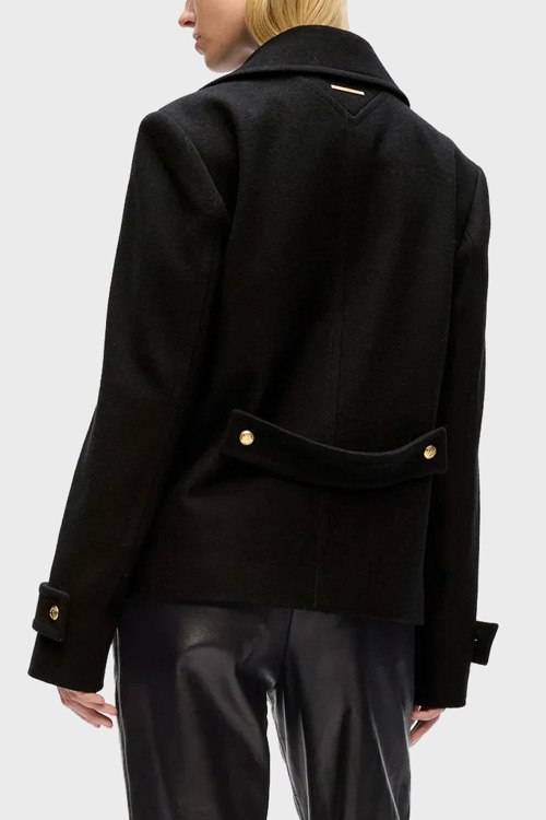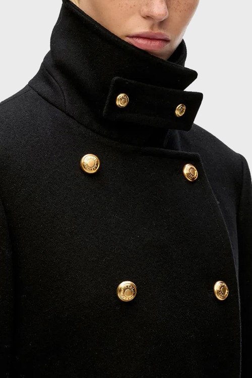 Детали: Женское черное шерстяное пальто от Karl Lagerfeld (Карл Лагерфельд). Двубортный фасон, отложной воротник, боковые карманы, застежка на золотистые пуговицы, короткая длина