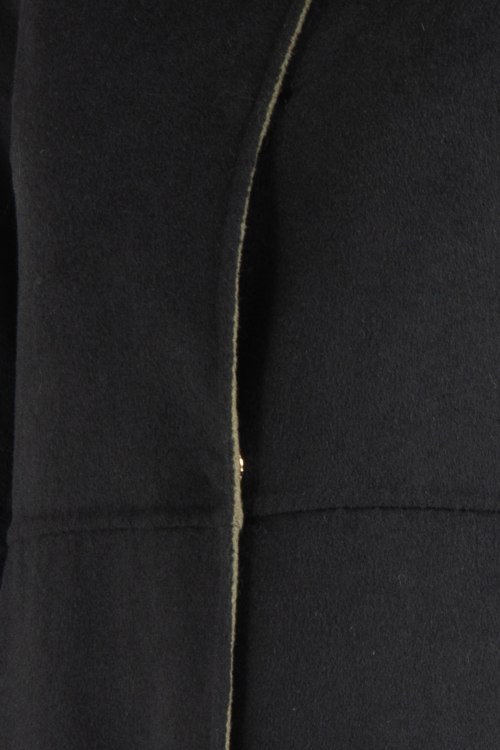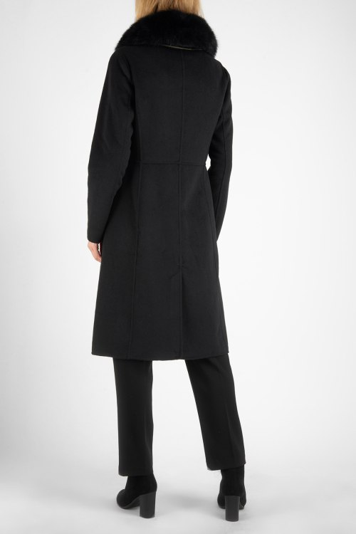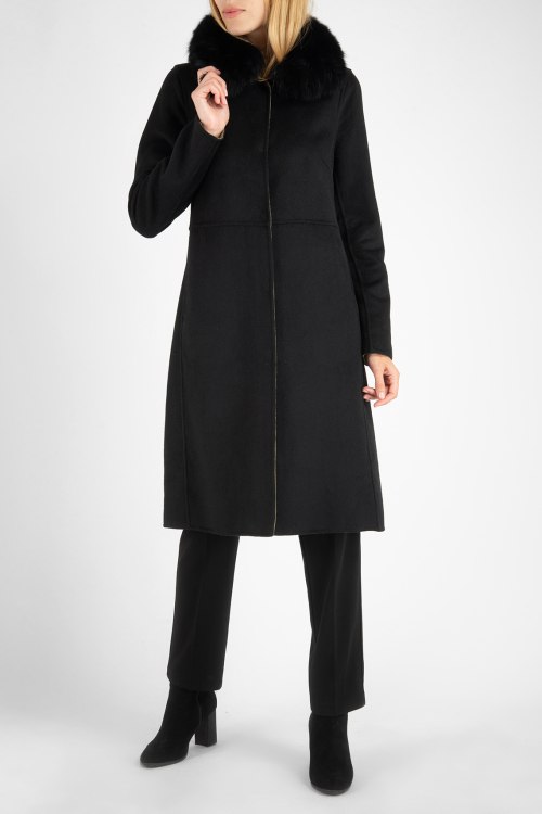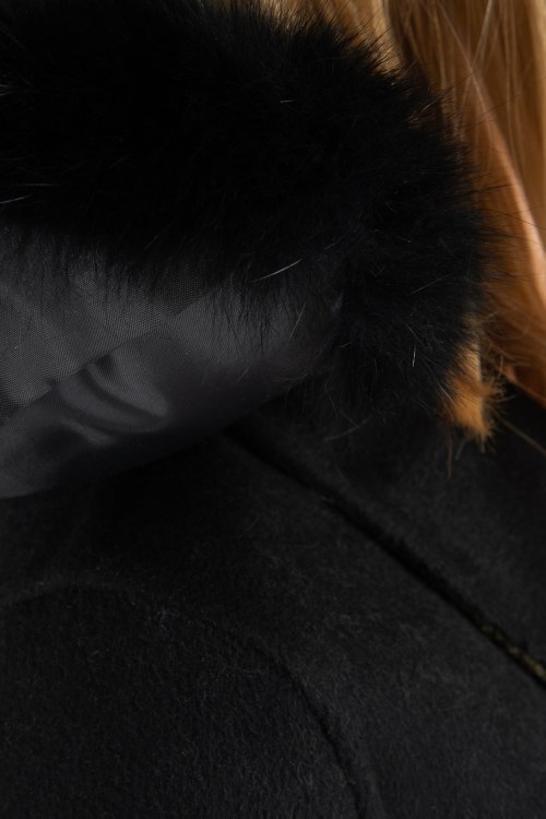 Черное пальто из шерстяного микса. Однотонная модель, объемный воротник с меховой отделкой, длина ниже колен