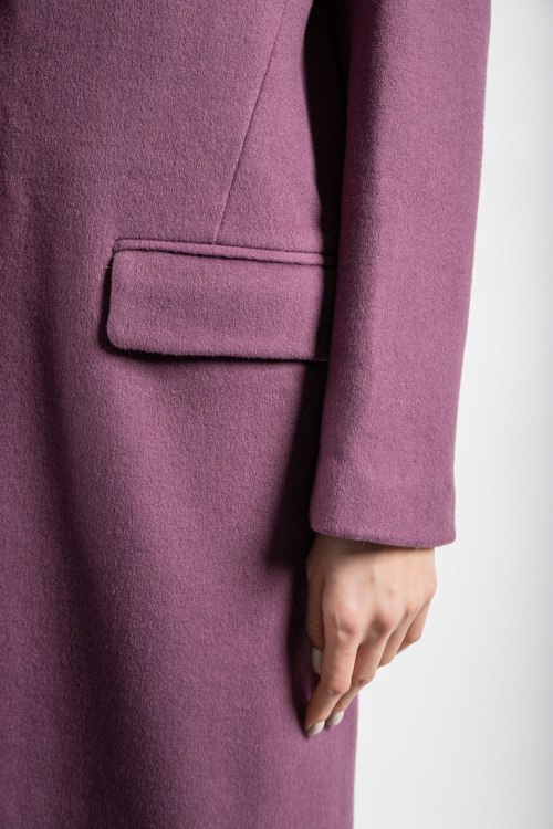 Женское фиолетовое пальто из шерстяного микса от Isabelle Blanche (Изабель Бланш). Длина миди, отложной воротник, застежка на три пуговицы на уровне талии, два кармана с клапаном, манжеты на пуговицах